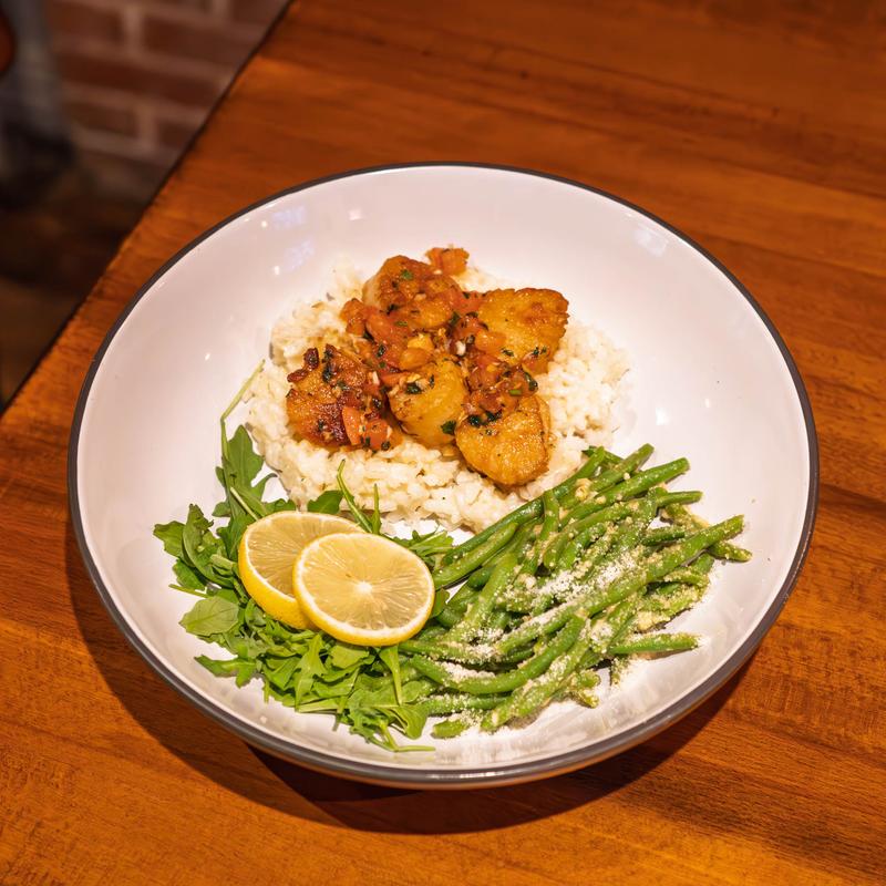 Pan-seared jumbo scallops, garlic butter, parmesan risotto, seasonal veg.