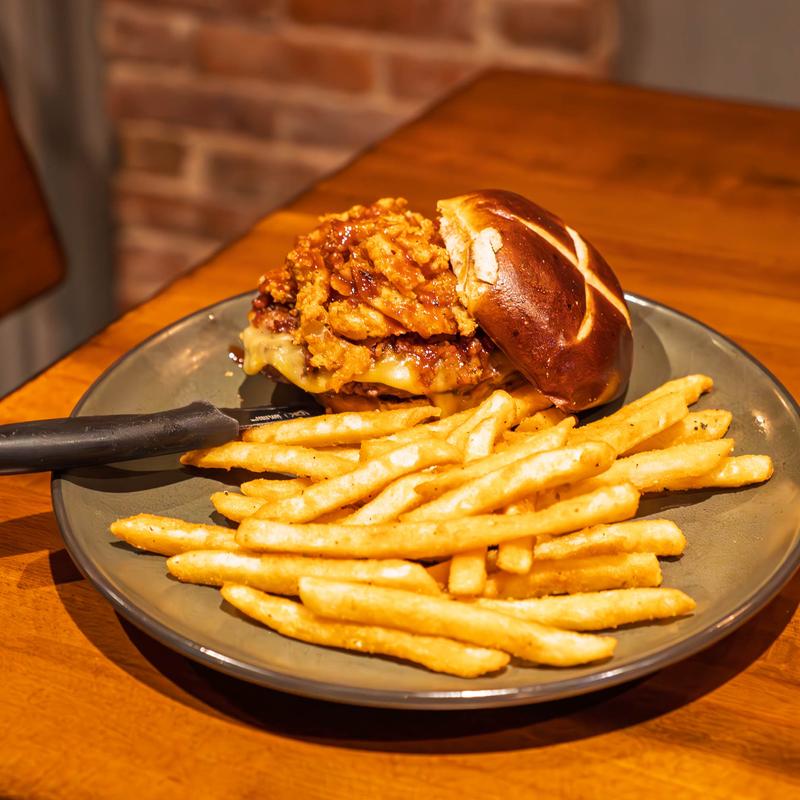 Gouda, BBQ frizzle onions, bacon marmalade, lettuce, tomato, onion, pretzel bun.